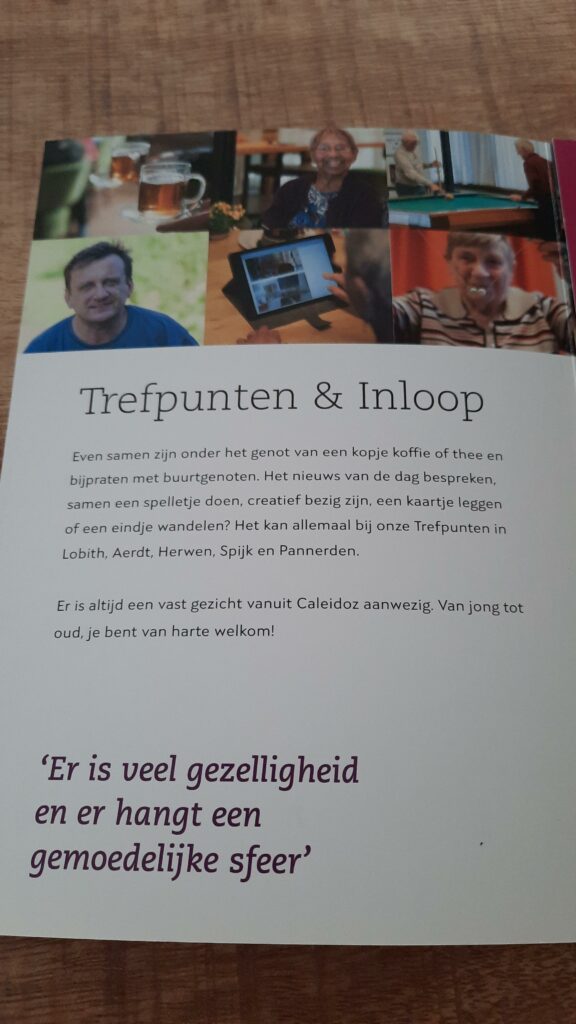 Elke dinsdagmiddag tussen 14.00 en 16.00 uur staat de deur van het dorpshuis open voor ’t trefpunt van Caleidoz. Onder het genot van een kopje koffie of thee kan het nieuws van het dorp en de dag worden besproken. Ook zijn er mensen die kaarten of een spelletje spelen. Iedereen is welkom van jong tot oud. Wees welkom! Je hoeft je niet aan te melden.